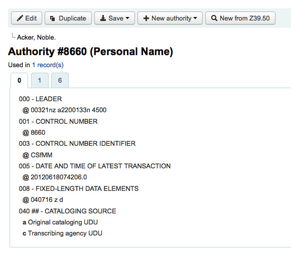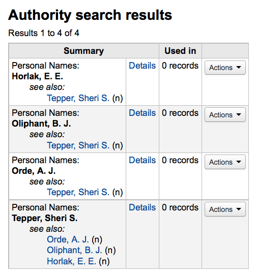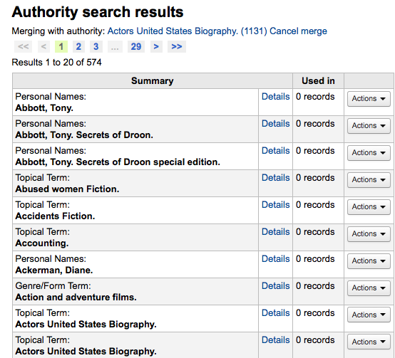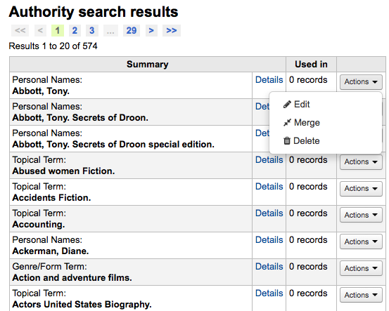 From the results you will see the authority record, how many bibliographic records it is attached to, an 'Actions' menu that includes the ability to edit, merge and delete (if there are no bibliographic records attached).