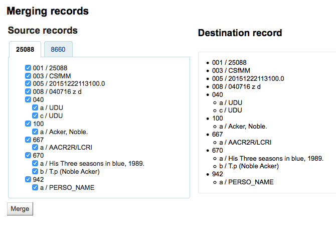 You will be presented with the MARC for both of the records (each accessible by tabs labeled with the authority numbers for those records). By default the entire first record will be selected, uncheck the fields you don't want in the final (destination) record and then move on to the second tab to choose which fields should be in the final (destination) record.