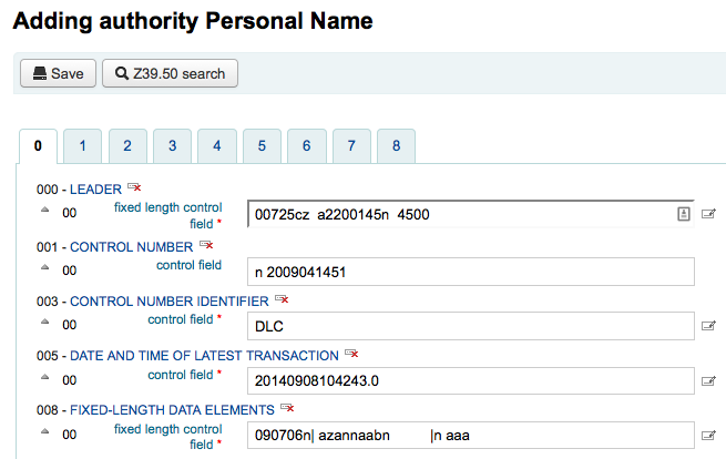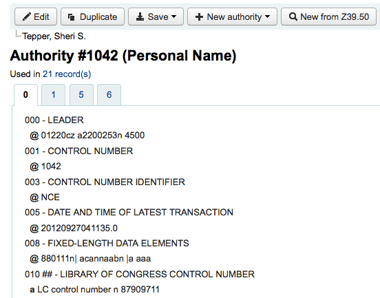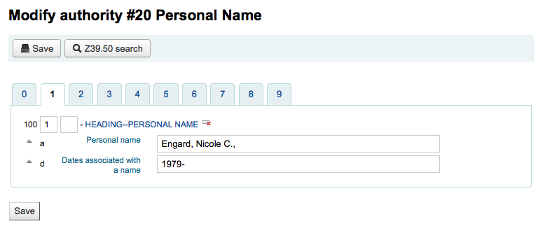 Once you've made the necessary edits, simply click 'Save' and dontmerge is set to 'Do', Koha will immediately update all of the bib records linked to the authority with the new authority record's data. If dontmerge is set to "Don't" then Koha won't edit bib records when changes are made to authorities, rather, this is done later by the merge_authority.pl cronjob.