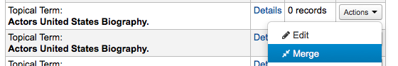 If you have duplicate authority records you can merge them together by clicking the 'Merge' link, found in the actions menu, next to two results on an authority search.