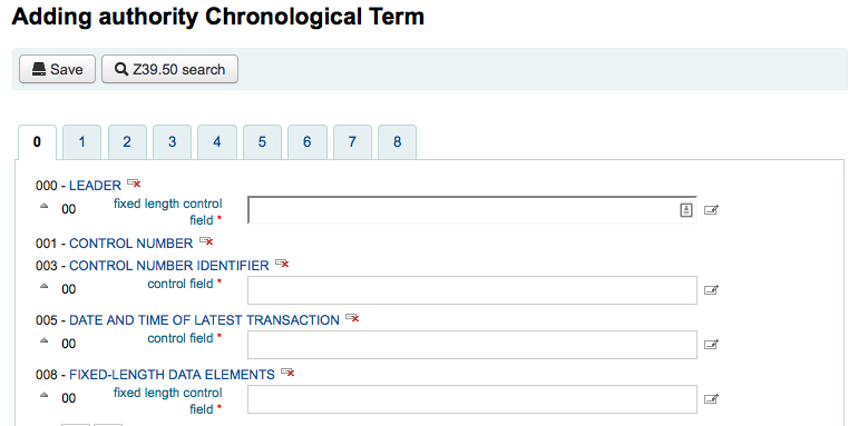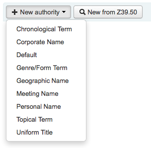 To add a new authority record you can either choose the authority type from the 'New Authority' button or search another library by clicking the 'New from Z39.50' button.