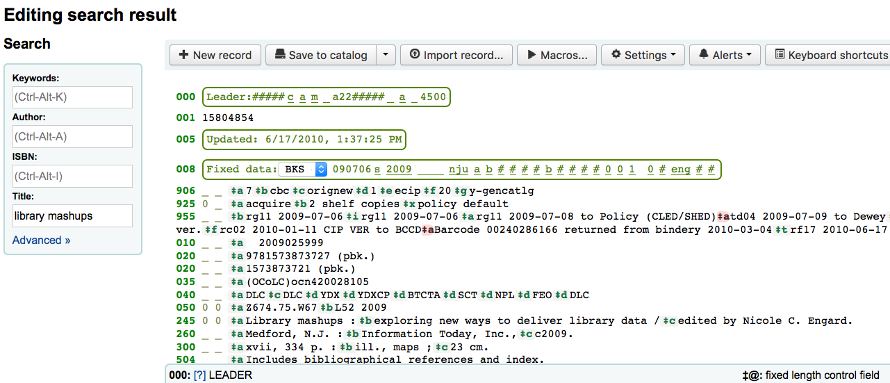 At the bottom of the editor you will see help from the Library of Congress for the field you are on. In cases where your MARC is invalid you will see red highlighting. To edit the record using only keyboard functions the Keyboard shortcuts button will inform you of the necessary commands