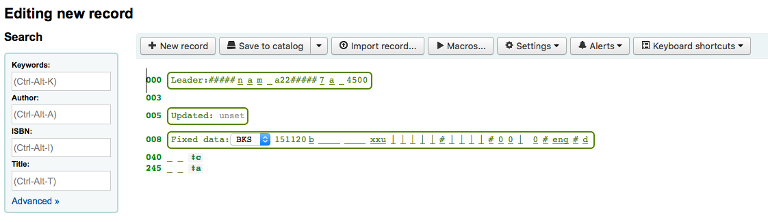 Shortcut Behavior Ctrl-D Insert delimiter (‡) Ctrl-H Get help on current subfield Ctrl-S Save record Ctrl-X Delete current field Ctrl-Shift-X Delete current subfield Enter New field on next line Shift-Enter Insert line break Tab Move to next position Shift-Tab Move to previous position 1.1.2.2 Macros in Advanced Cataloging