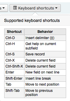 The following keyboard shortcuts can be used in the advanced cataloging module to save time and clicking.