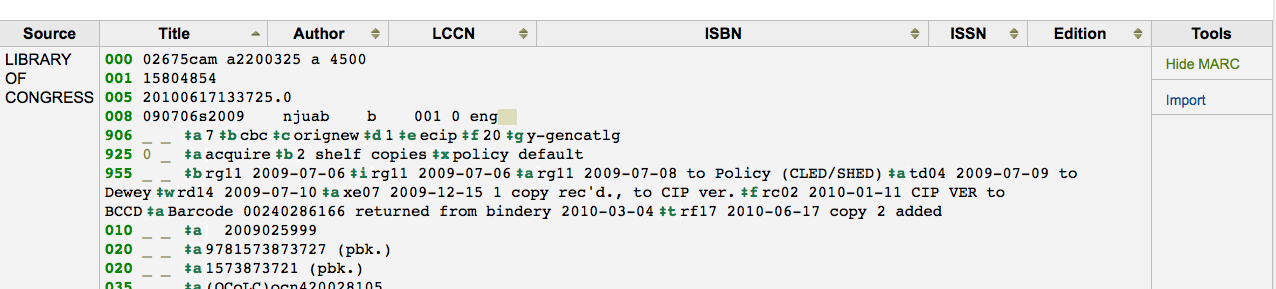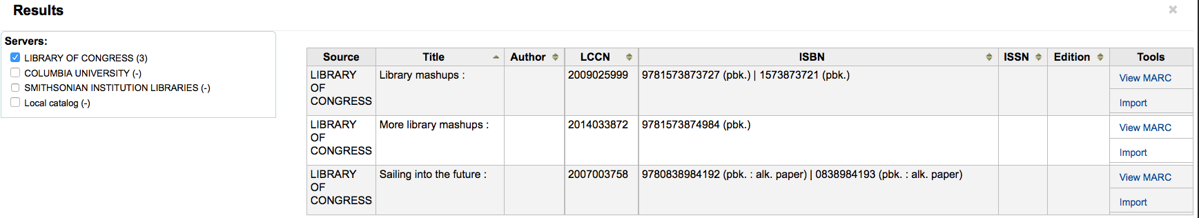 And from those Z39.50 results you can view the marc record by clicking the link to the right