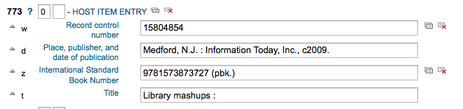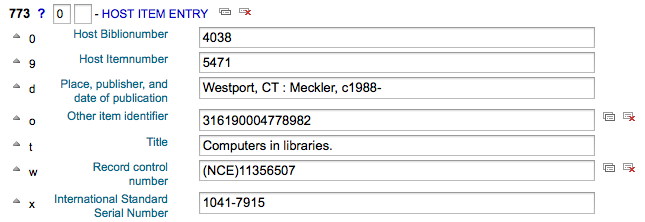 This will open a new blank record for cataloging. The blank record will only have the 773 field filled in properly to complete the link once the record is saved.