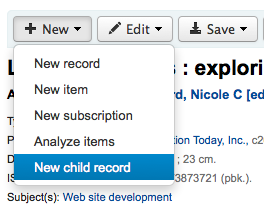After cataloging your original record (see Adding Records for more on creating records) click 'New' from the normal view and choose to 'New child record.'