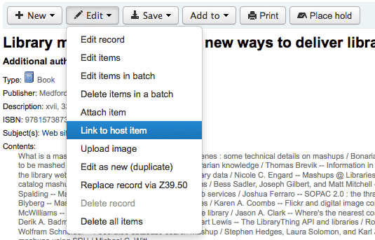 After cataloging your analytic record (see Adding Records for more on creating records) click 'Edit' from the normal view and choose to 'Link to Host Item'