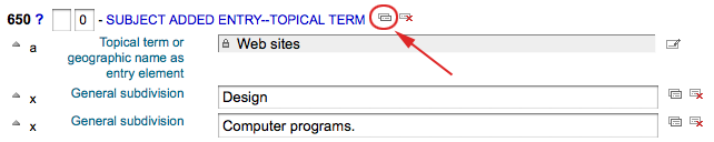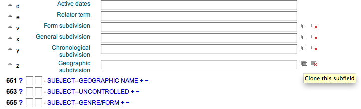 To duplicate a subfield click on the clone icon (to remove a copied field, click the delete clone icon) to the right of the field
