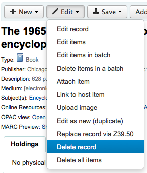 To delete a bibliographic record simply choose the 'Edit' button and select 'Delete record'