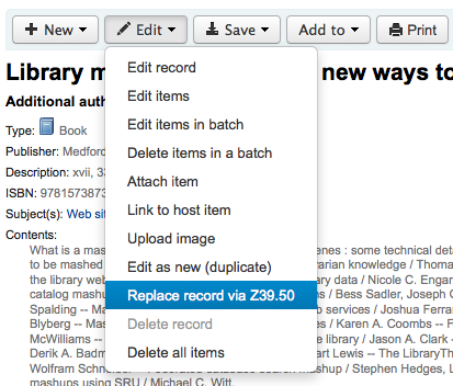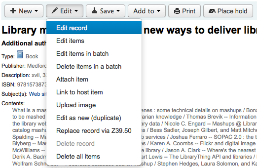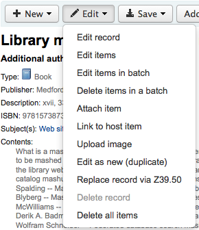 or by clicking the Edit button on the Bibliographic Record and choosing 'Edit Record'