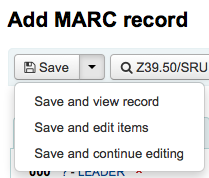 Once you've finished, click the 'Save' button at the top and choose whether you want to save and view the bib record you have created or continue on to add/edit items attached to the record