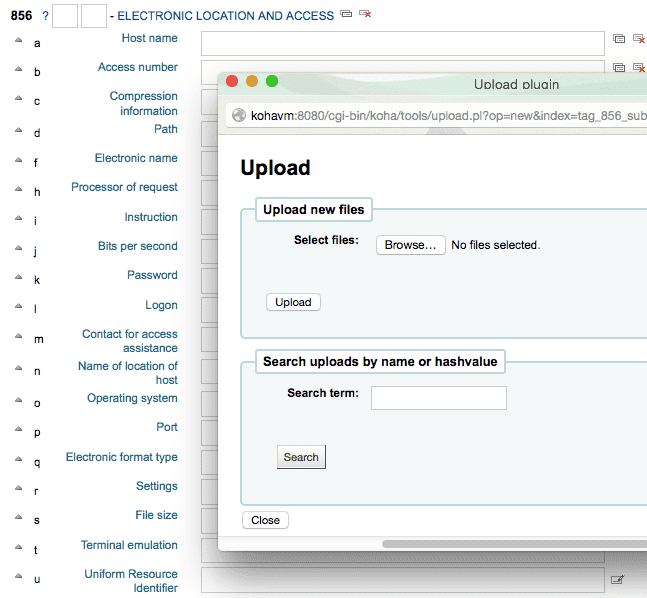 Once you are all set up you can continue with cataloging as regular. You will see a plugin icon next to the 856$u that will open up the upload and/or search window