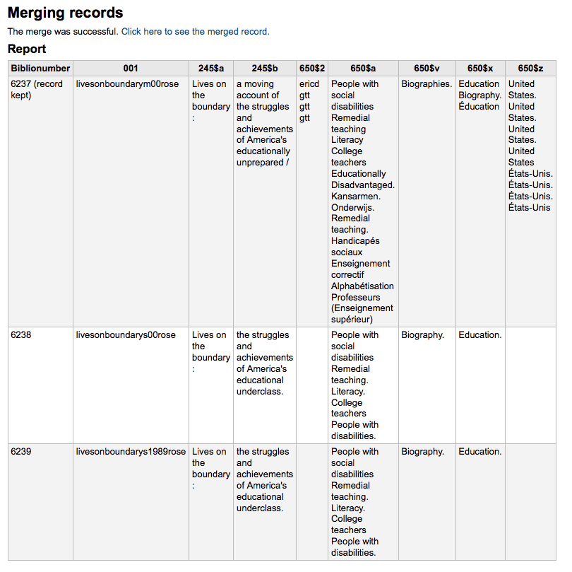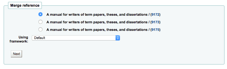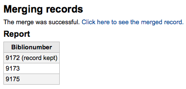 Once you have selected the records you want to merge, click the 'Merge selected' button at the top of the list. You will be asked which of the records you would like to keep as your primary record and which will be deleted after the merge. If the records were created using different frameworks, Koha will also ask you what Framework you would like the newly merged record to use.