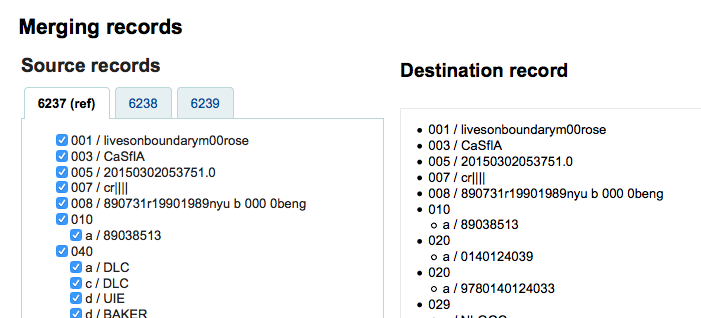 You will be presented with the MARC for all of the records (each accessible by tabs labeled with the bib numbers for those records). By default the entire first record will be selected, uncheck the fields you don't want in the final (destination) record and then move on to the second tab to choose which fields should be in the final (destination) record.