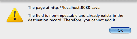 Should you try to add a field that is not repeatable two times (like choosing the 245 field from both record #1 and #2) you will be presented with an error