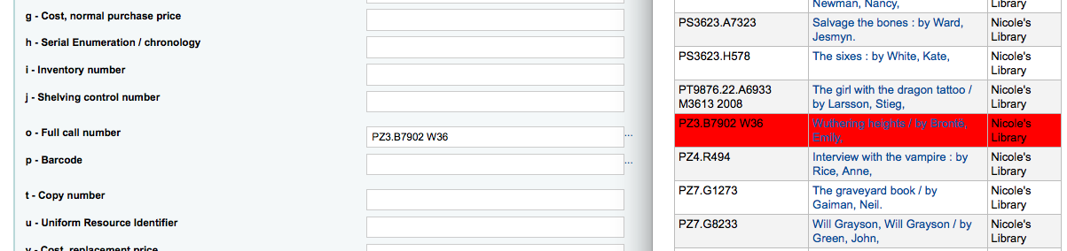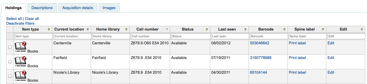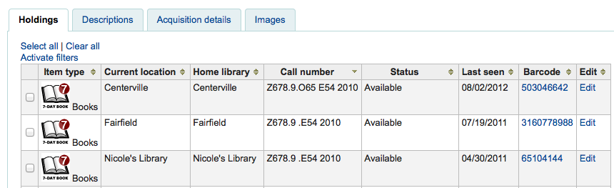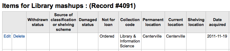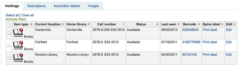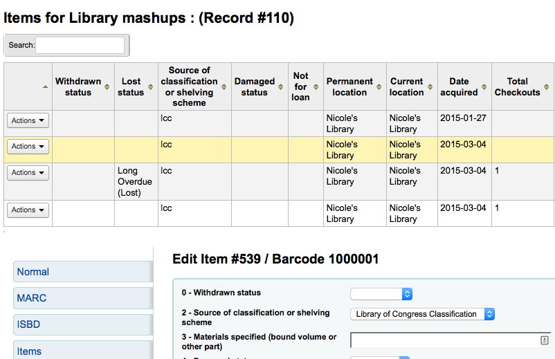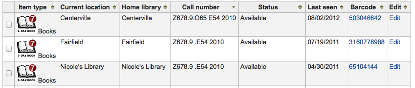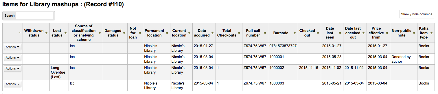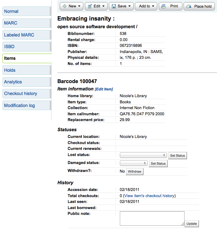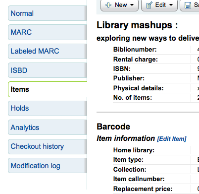 In Koha each bibliographic record can have one or more items attached. These items are sometimes referred to as holdings. Each item includes information to the physical copy the library has.
