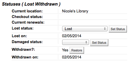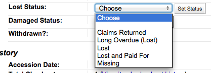 From this view you can mark an item lost by choosing a lost status from the pull down and clicking the 'Set Status' button.