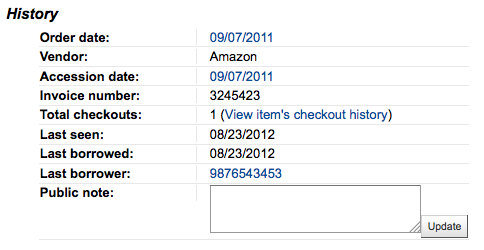 In the History section you will see infomration about the check out history of the item and if you ordered the item via the acquisitions module then this section will include information about the order.