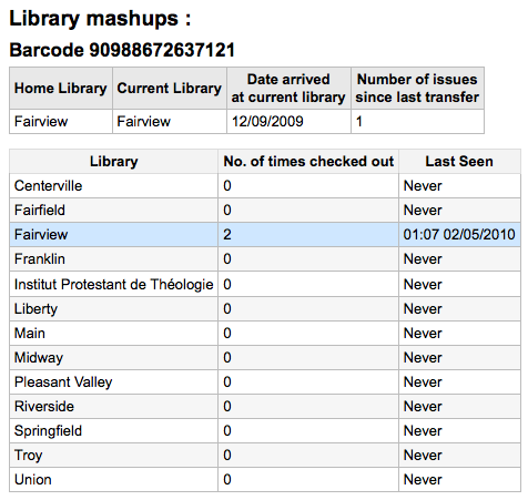 Each bibliographic record keeps a circulation history (with or without the patron information depending on your settings), but each item also has its own circulation history page. To see this, click on the 'Items' tab to the left of the record you are viewing.