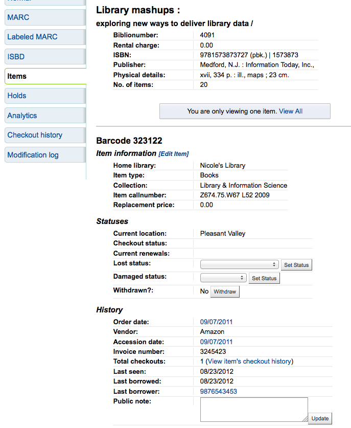 Clicking that tab will give you basic information about the items. From here you can see basic information about the item such as the home library, item type, collection code, call number and replacement price. You can also see and edit the status information. If an item is marked lost or withdrawn you will also see the date that status was applied.