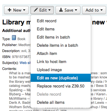 Sometimes a copy of the record you need to catalog can't be found via Z39.50. In these cases you can create a duplicate of similar record and edit the necessary pieces to create a new record. To duplicate an existing record click 'Edit as New (Duplicate)' from the Edit menu on the Bibliographic Record